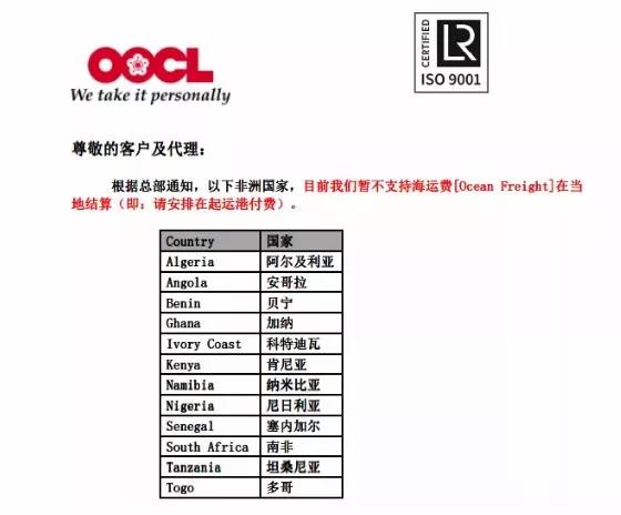 东浩物流作为专业国际海运公司,了解到最新消息:OOCL东方海外最新通知:出口到这些非洲国家的海运费需在起运港预付,根据OOCL东方海外近日发出的紧急通知,这些部分非洲的国家暂不支持海运费在当地结算,需要在起运港预付!也就是不能做到付了。