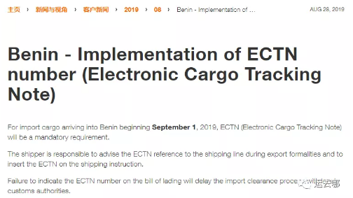 各位有出口到非洲贝宁的外贸出口企业和国际货代公司的朋友们请注意,从2019年9月1号开船日起,贝宁当局政府已正式开始实施新的ECTN(ELECTRIC CARGO TRACKING NUMBER,电子货物跟踪单)新郑规则!目前HPL赫伯罗特、CMA达飞、MSC地中海等船公司纷纷发出了紧急通知!