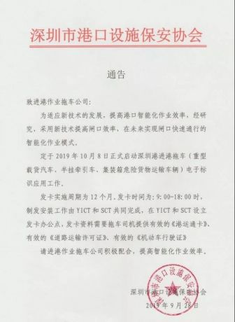 接深圳市港口设施保安协会通知,从2019年10月8日正式启动深圳港进港拖车电子标识应用工作。我公司将从2019年10月14日起为所有进出盐田港区的拖车安装电子标签,具体安排如下: