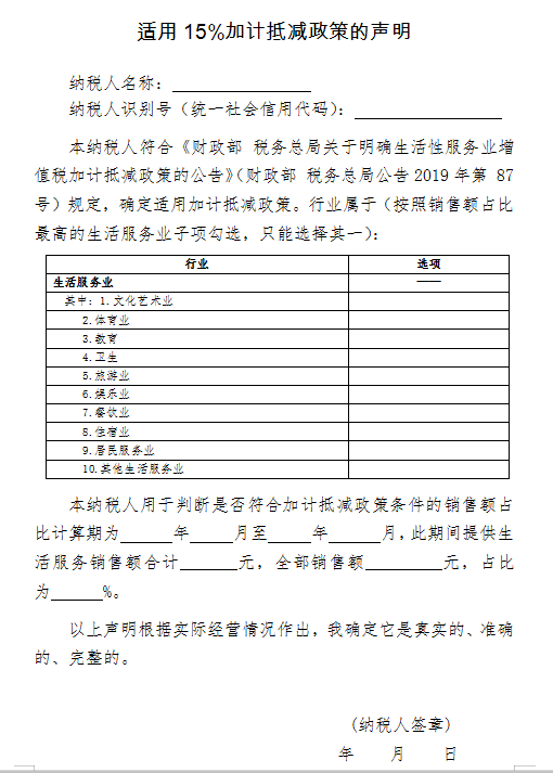 一、符合《财政部税务总局关于明确生活性服务业增值税加计抵减政策的公告》(财政部税务总局公告2019年第87号)规定的生活性服务业纳税人,应在年度首次确认适用15%加计抵减政策时,通过电子税务局(或前往办税服务厅)提交《适用15%加计抵减政策的声明》(见附件)。