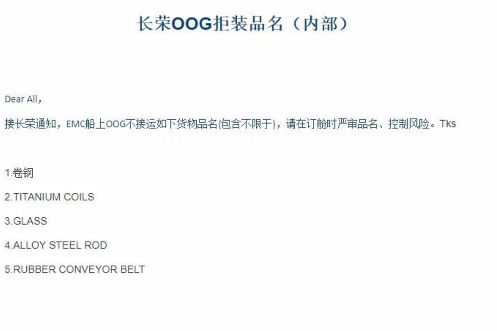 长荣海运EMC船上OOG不接运卷钢等5类货物品名(包含不限于),请在订舱时严审品名、控制风险。