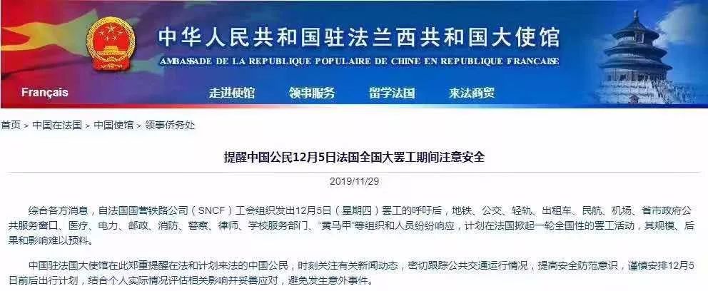 根据中华人民共和国驻法兰西共和国大使馆消息,从2019年12月5日开始,法国将开始历史上最大规模、涉及超过15个行业及组织的无限期大罢工。