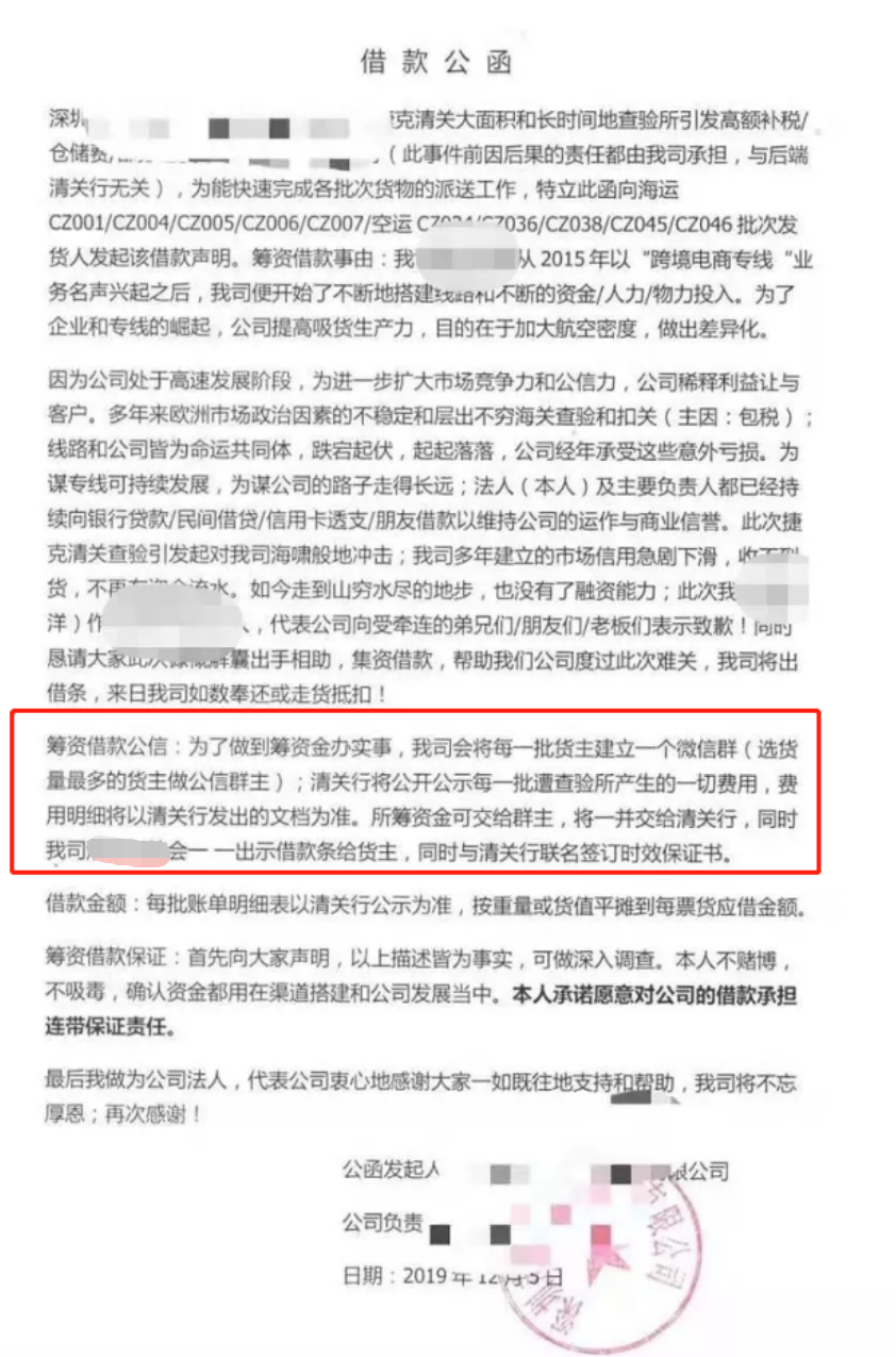 情况大概是这样:一家在市场还有一定知名度的做欧洲海空派专线的物流公司,由于其捷克清关大面积长时间查验引发的高额补税以及仓储费用。导致现金流枯竭,该公司不得不向被扣的客户发出声明,针对5个批次的海运和5个批次的空运被扣的客户“借款赎货”。