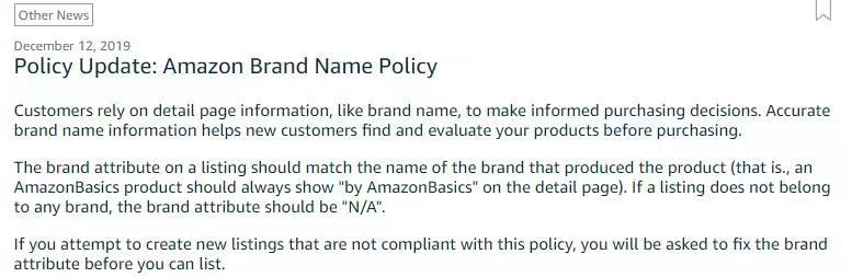 2019年12月12日亚马逊发布品牌名称政策新规:无品牌备案的lisitng不能随意填写品牌名称!