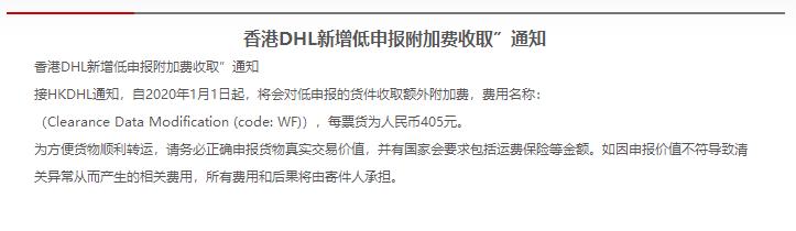 收到香港DHL通知,自2020年1月1日起,将会对低申报的货件收取额外附加费,费用名称:(Clearance Data Modification (code: WF)),每票货为405元。