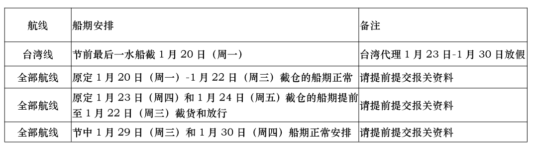 节后第一班车1月30日(周四)下午 17:00截货截资料,1月31日(周五)过港。