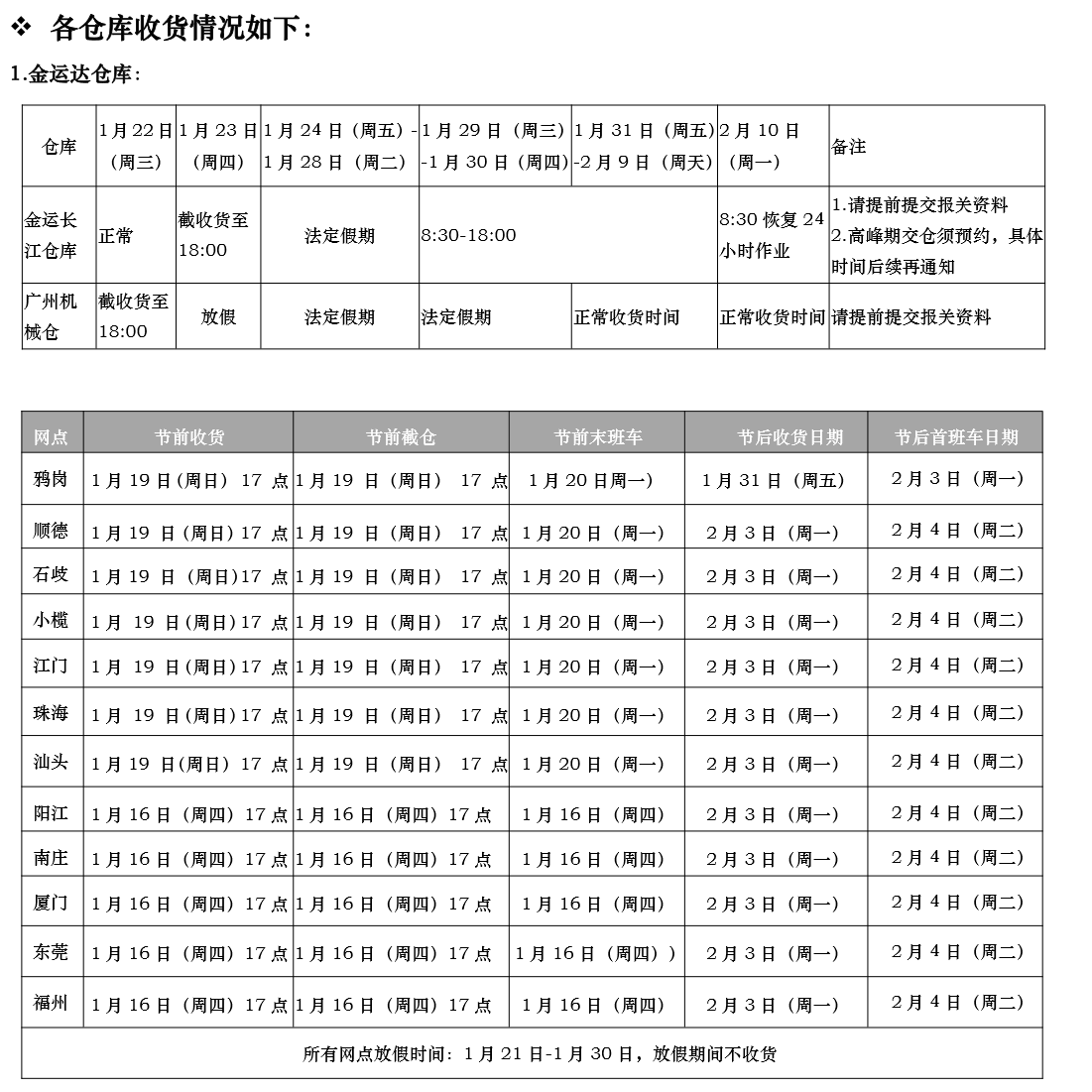 顺德.江门.珠海节前提前至1月21日(周二)11:00 截仓; 汕头仓节前提前至1月15日(周三)截仓。