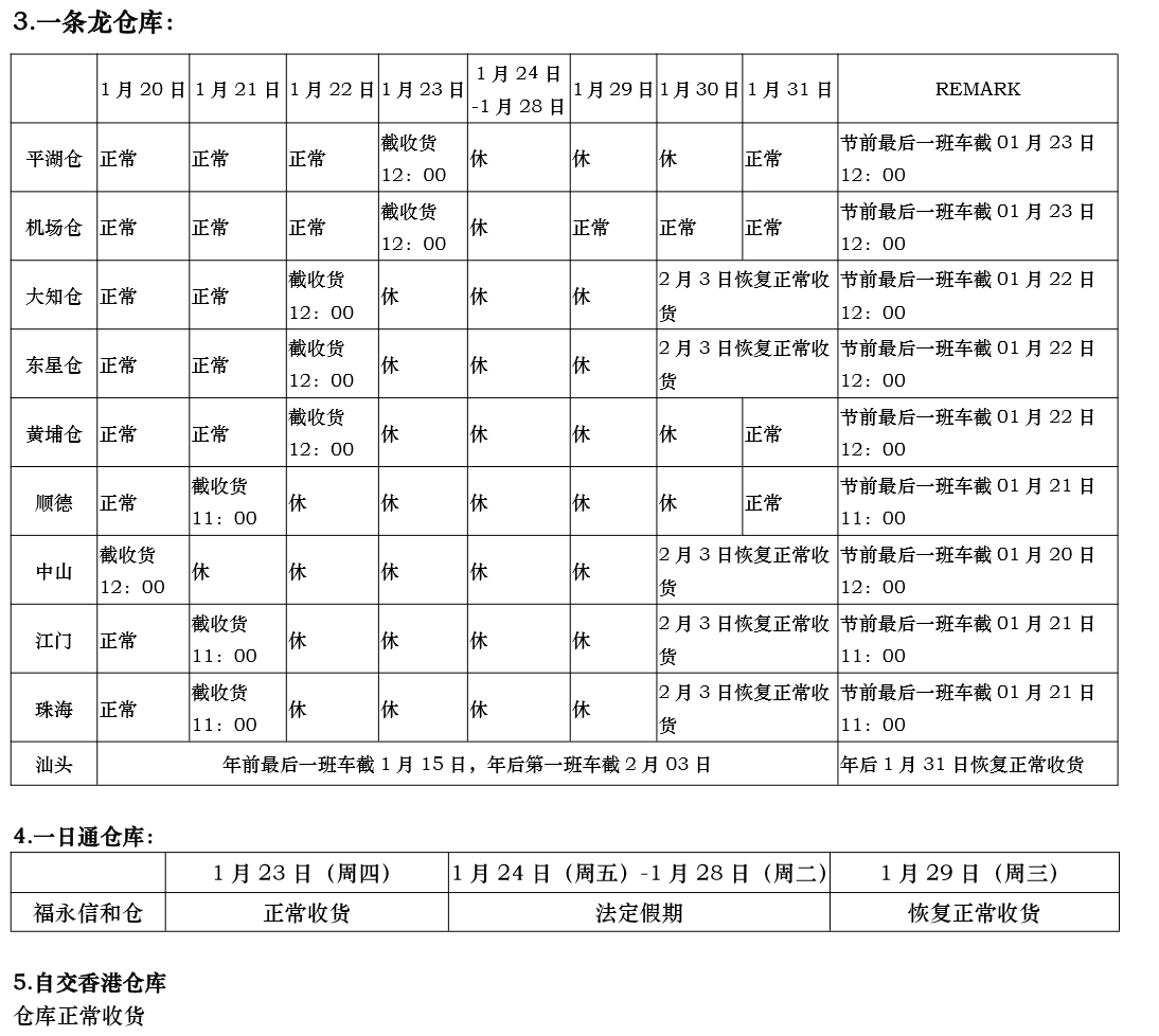 广州仓和东莞节前提前至1月22日(周三)12:00 截仓; 中山仓节前提前至1月20日(周一)12:00 截仓,