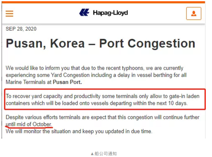 由于最近的台风,韩国港口目前正遭遇堆场拥堵,包括在釜山港口所有海运码头的船舶停泊延迟。