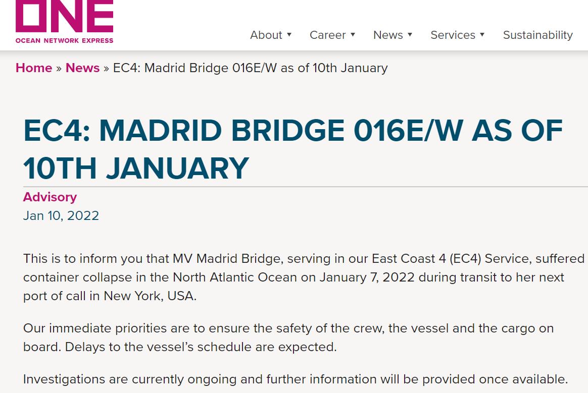 ONE船公司昨日发布通知表示,服务于其East Coast 4(EC4)服务的集装箱船“Madrid Bridge”于2022年1月7日在北大西洋发生集装箱倒塌事故。事故发生时,该船正前往其下一个停靠港纽约港。
