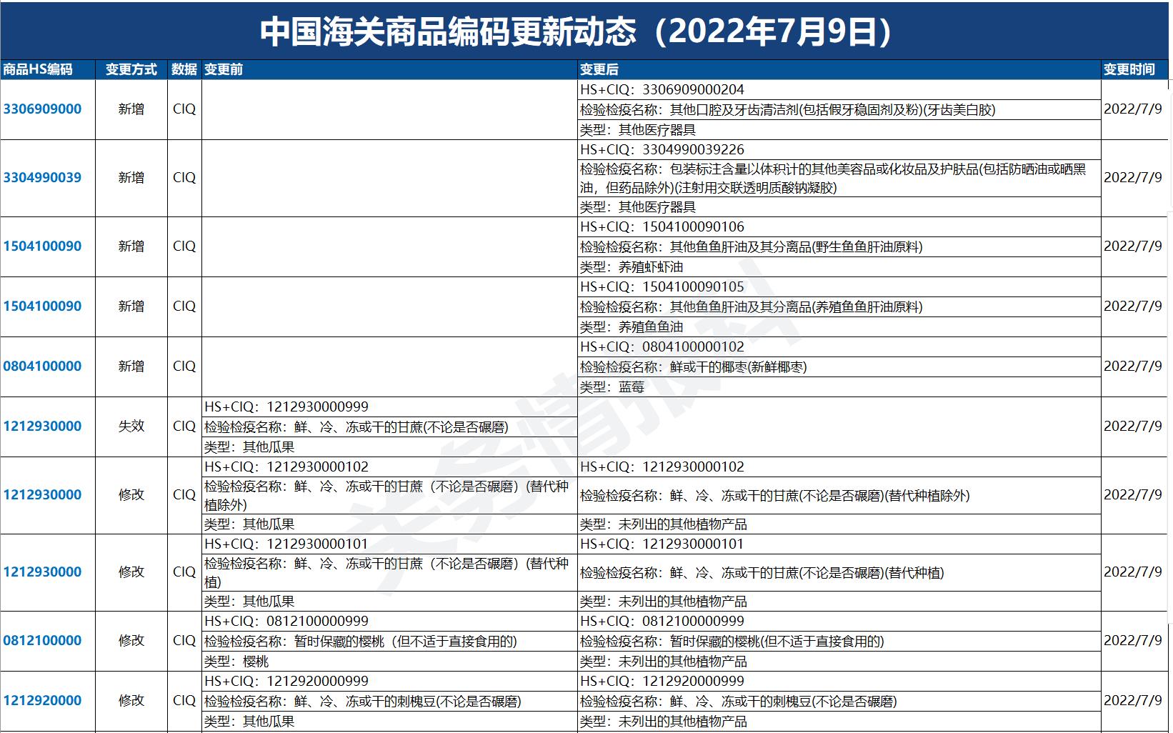 以下为2022年7月9日中国海关商品编码更新内容截图,完整版: