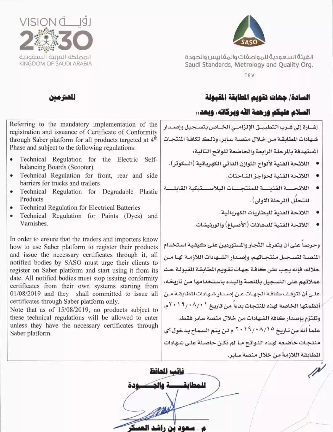 请各相关企业注意,所有沙特当地进口商必须在SABER平台进行公司信息注册,并通过SABER平台获取符合性证书,自今年1月1日起将不再接受SABER平台以外的途径获取的符合性证书。
