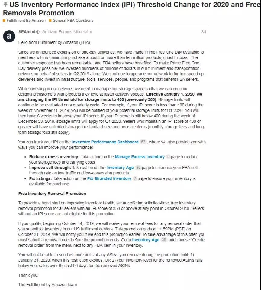 东浩物流了解到亚马逊在卖家论坛发布公告称IPI分数由350提高到400,公告看下图: