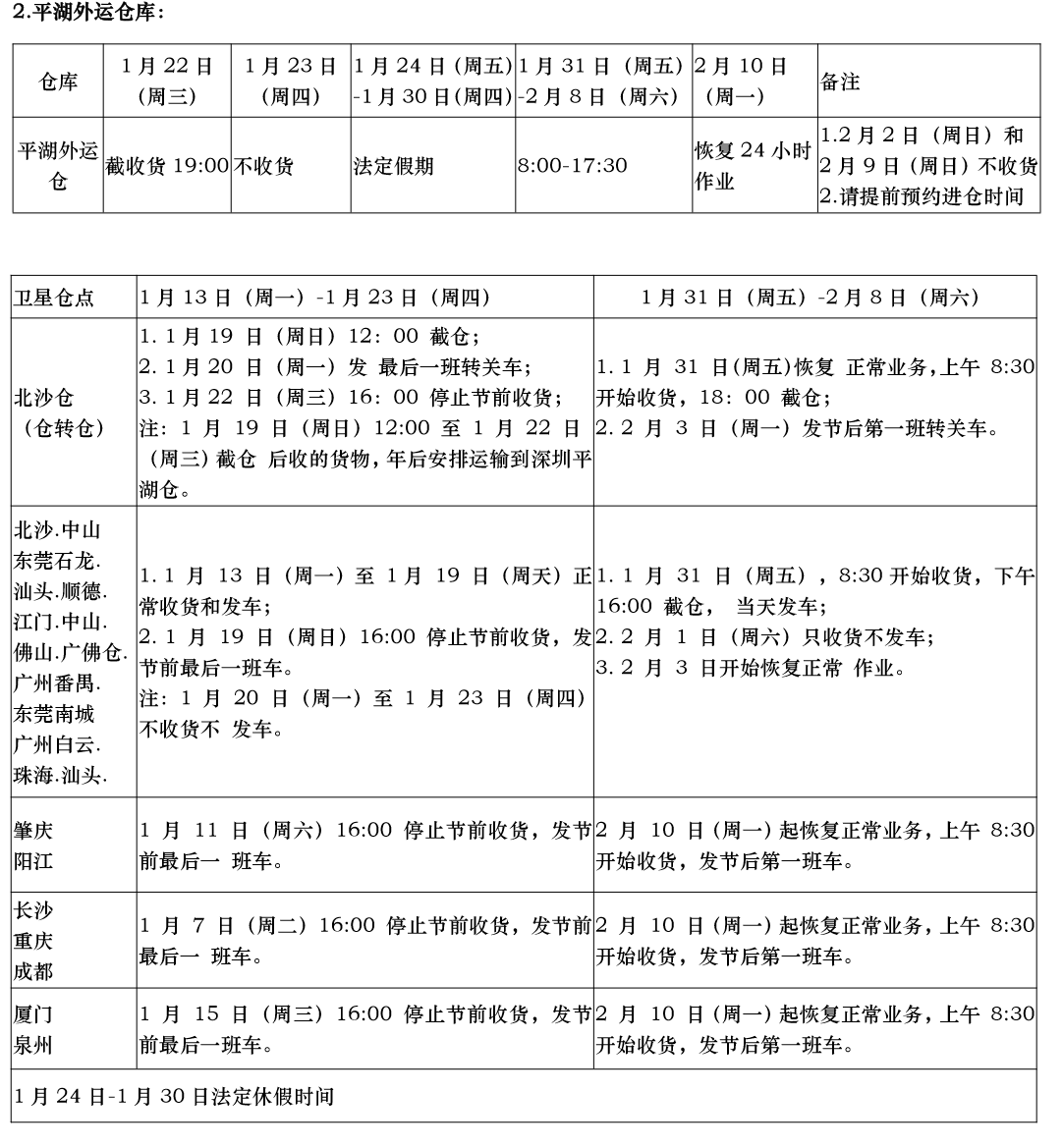 深圳仓节前1月23日(周四).1月24日(周五)截仓的提前至1月23日(周四)12:00 截仓;