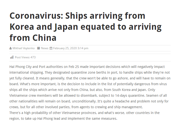 东浩物流专业国际物流服务,中国到越南海运,海防、胡志明、河内等港口是东浩核心业务之一,实时关注越南海运动态,随着肺炎疫情在韩国和日本扩散,了解到肺炎疫情影响越南海运港口隔离检疫日本韩国船舶