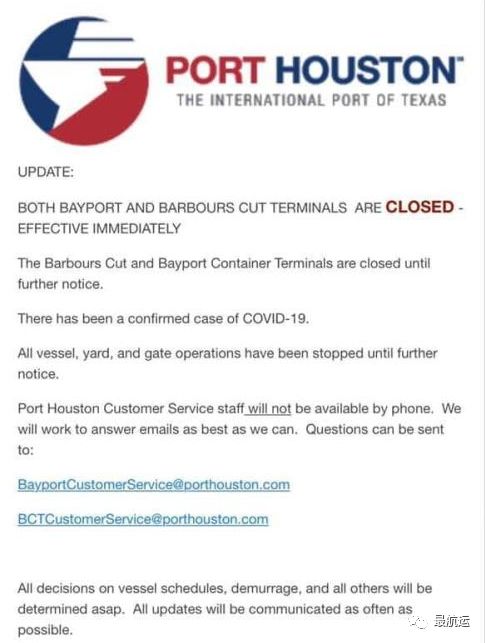 休斯敦港务局了解到,在Bayport和Barbours Cut集装箱码头工作人员被检测出COVID-19冠状病毒呈阳性。鉴于这一信息,官方十分谨慎,在进行彻底调查期间,两个公共码头均已紧急关闭立即生效,所有船舶,堆场和闸口操作全部停止!