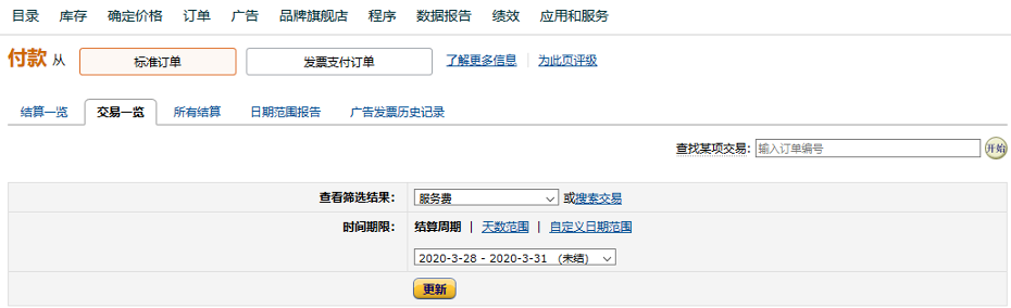 3 月份的库存仓储费将在 4 月 7 日至 4 月 15 日期间处理。您可以在付款报告的交易一览中查看月度仓储费(卖家平台>数据报告>付款>交易一览)。将查看筛选结果设置为按服务费查看,并选择一个包含 4 月份日期的范围。