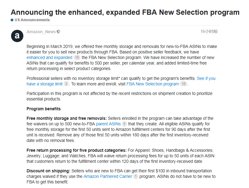 了解到亚马逊发布FBA新选品计划“升级版”,自 2020 年 4 月 1 日起,参与亚马逊物流新选品计划的卖家对于符合要求的 ASIN(新创建的使用亚马逊物流),将免除月度仓储费、移除费和退货处理费。 此外,新的亚马逊物流卖家有资格享受亚马逊合作承运人运费优惠 $100 的折扣。