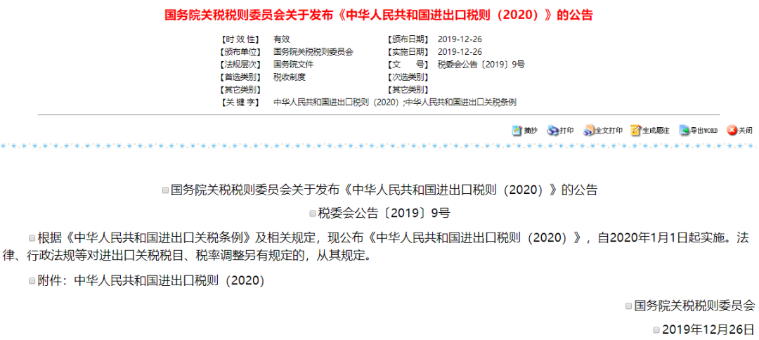 《中华人民共和国进出口税则(2020)》,自2020年1月1日起实施。法律、行政法规等对进出口关税税目、税率调整另有规定的,从其规定。
