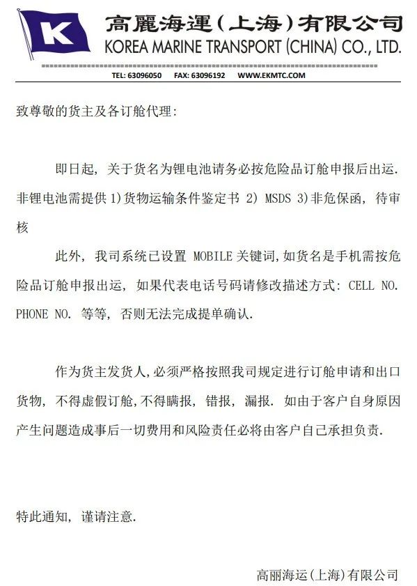 KMTC船公司官方发布通知,于2020年7月6日起, 关于货名为锂电池请务必按危险品订舱申报后出运,非锂电池需提供一下资料: