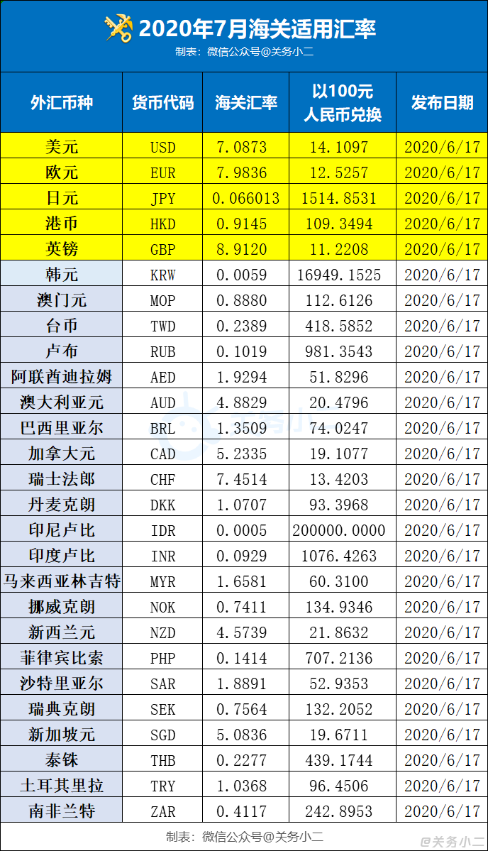 2020年7月海关汇率(对比):