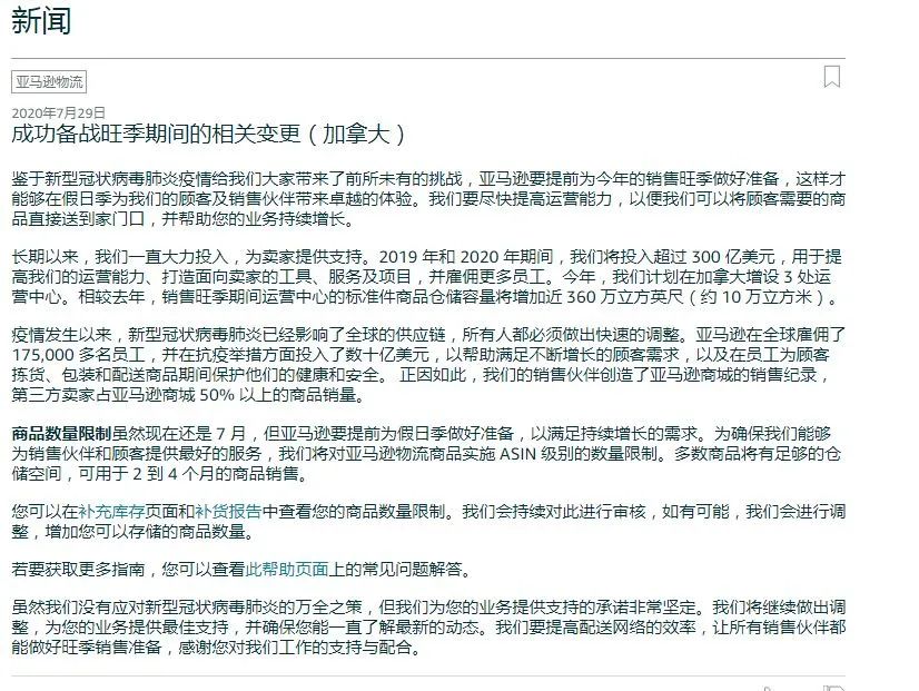 但是亚马逊在通告中也表示了会根据卖家的销量和库存限制发货数量,如果卖家的库存已经发够2-3个月的销量的话,则可能会被限制。