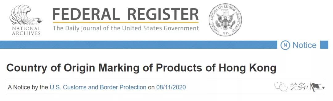 此前2020年8月11日,美国海关与边境保护局(下称CBP)发布了联邦公报通知,要求2020年9月25日起,原产自香港的货物出口到美国必须标明来源地是“中国”,而不能再贴“香港制造”标签。随后美国应一些业界的要求,将该措施的实施日期延后45天,即推迟至2020年11月9日实施。