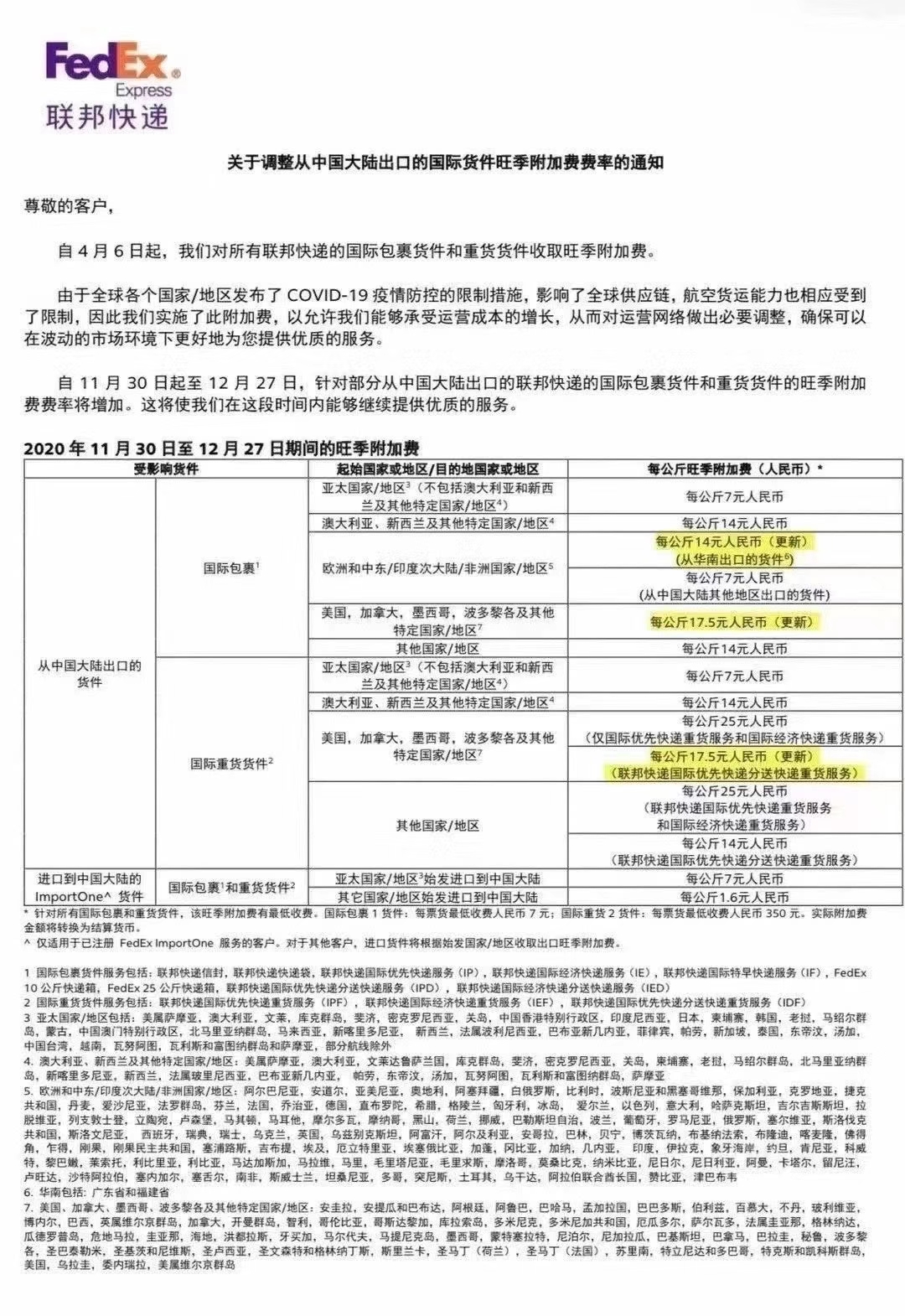 大陆FEDEX和大陆TNT通知,自2020年11月30日起,旺季附加费调整如下: