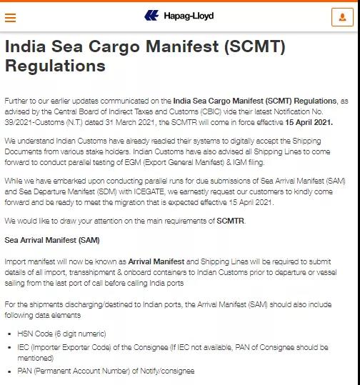 东浩物流作为一家专业全球海空运国际物流服务,实时关注国际物流咨询及各国海关新规,分享出口到印度海运注意!海关再出海运货物舱单及转运新规,印度财政部、税务部和海关委员会 (CBIC)于2021年3月31日发出第39/2021-Customs (N.T.)号通知,就印度海上货物舱单(SCMT)法规进行了更新,SCMTR将于2021年4月15日生效。