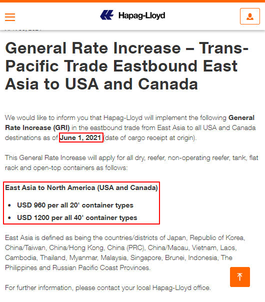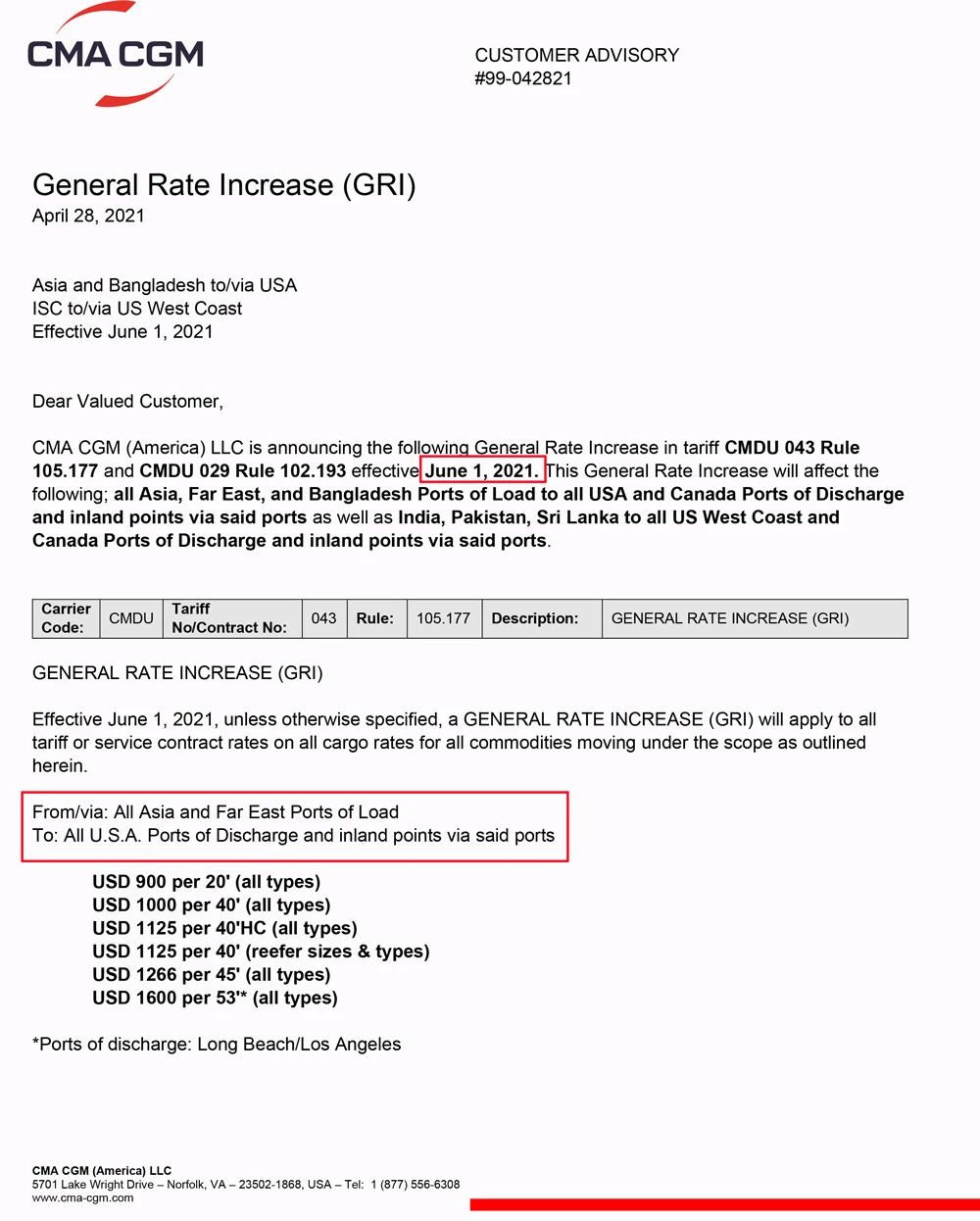 美国海运是东浩物流核心业务之一,包含美国FBA海运头程及传统海运到港和DDU/DDP到门服务,温馨提示美国海运涨价居多,各大船公司继续涨价!以下为部分船公司最新涨价通知!首先看看HPL的涨价通知,HPL6月1日起上调美国海运GRI,最高上调1200美元: