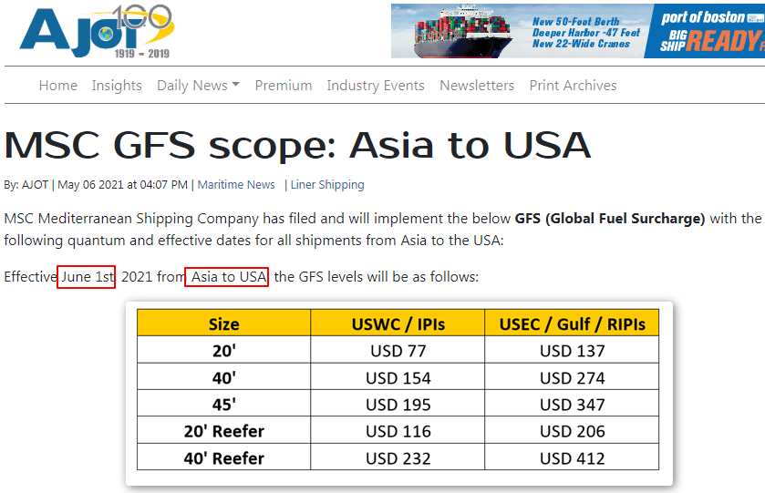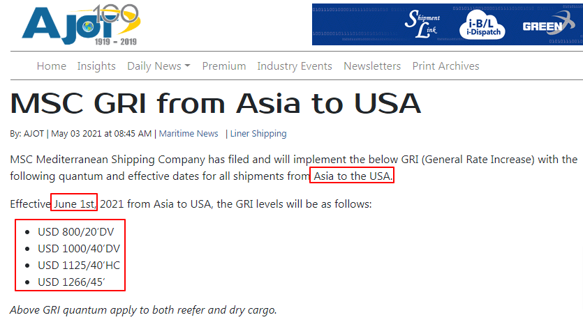 MSC地中海上调亚洲-美国海运航线的GRI及燃油附加费: