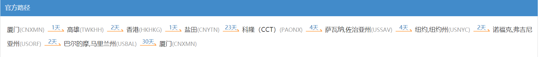 据了解长程(Ever Forward)船大量中国始发的货物,挂靠港为中国厦门、台湾高雄高、中国香港、中国盐田始往美国,参考路径如下: