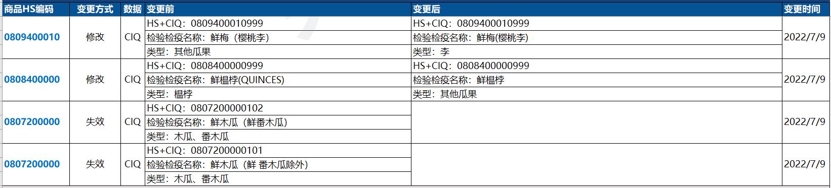 以下为2022年7月9日中国海关商品编码更新内容截图,完整版: