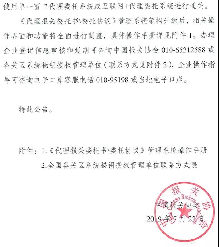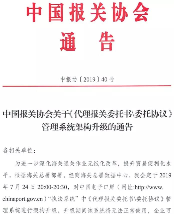 为进一步深化海关通关作业无纸化改革,提升贸易便利化水平,根据海关总署部署,经商海关总署数据中心,中国报关协会定于2019年7月24日20:00-20:30,对中国电子口岸系统进行架构升级,升级期间将无法正常使用,企业可使用单一窗口代理委托系统或互联网+代理委托系统进行通关,望各位知悉。